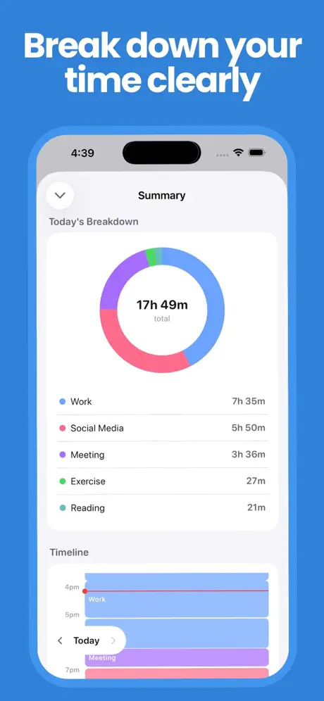 Before exporting, Log Time gives you a visual breakdown of your day. The summary view shows a donut chart with time spent per activity, and the timeline view lays out your entire day so you can spot patterns at a glance.