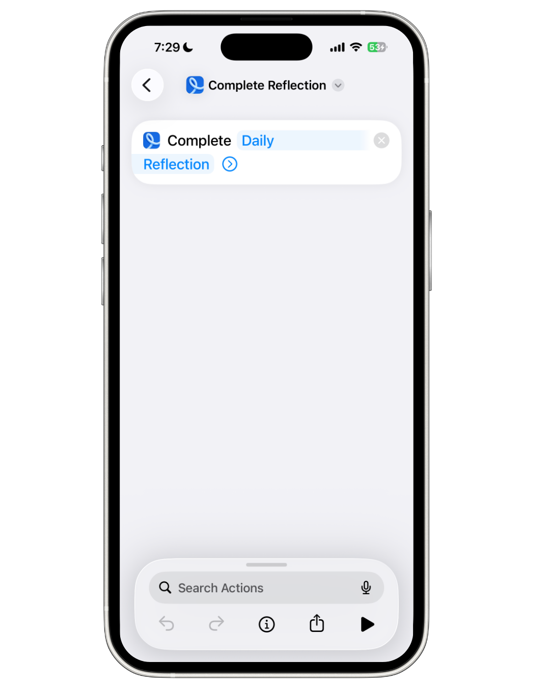 Select Complete Habit and pick the specific habit you want to auto-complete (e.g., "Daily Reflection"). Rename the shortcut to something descriptive so it's easy to find when setting up automation.