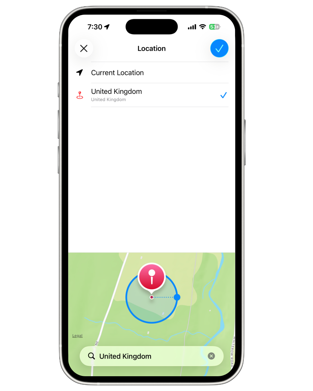 Search for and select the location where you want the automation to trigger (e.g., your gym, office, or home). The map shows the geofence radius around your chosen location.