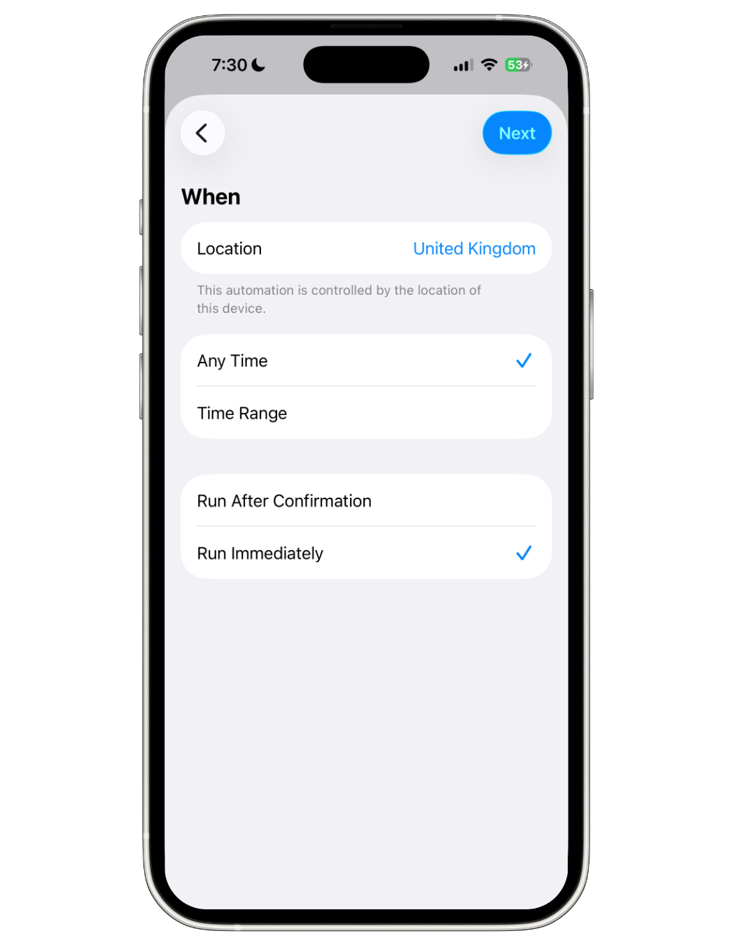 Choose Any Time or set a specific time range. Select Run Immediately so the habit completes automatically without asking for confirmation every time.