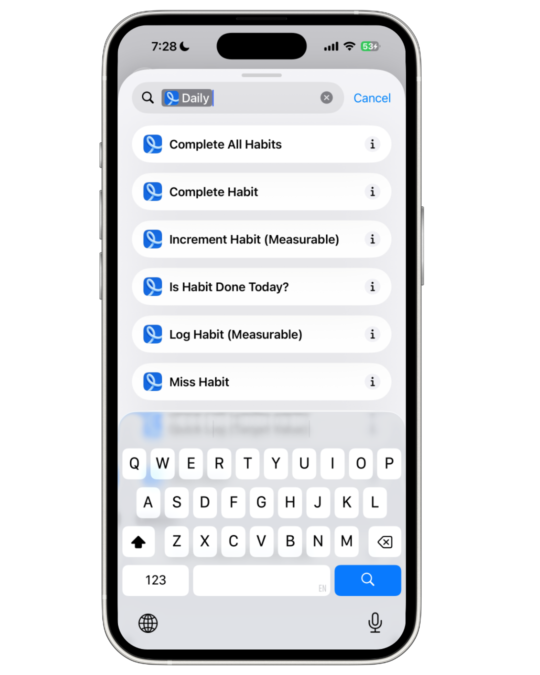 Open the Shortcuts app, tap + to create a new shortcut, and search for "Daily" to find the habit actions. You'll see options like Complete All Habits, Complete Habit, Increment Habit, and more.